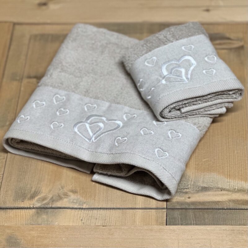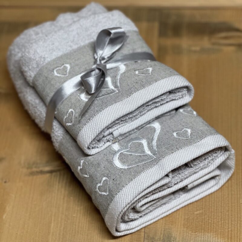 Coppia asciugamani da bagno viso + ospite con bordo ricamato cuoricini, 100% cotone in spugna, grigio