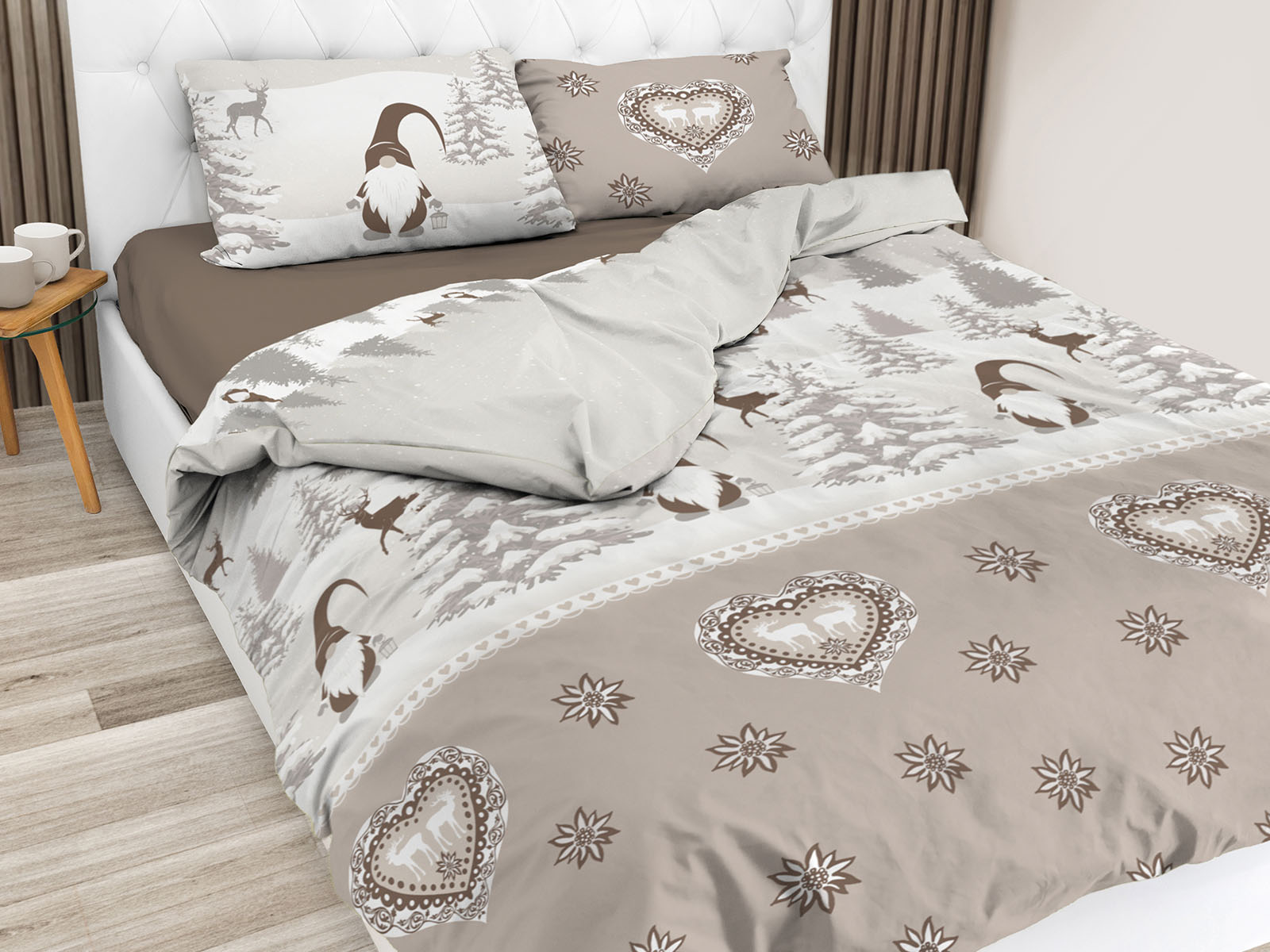 Parure copripiumino con gnomi foletti cervi e paesaggio invernale, stile tirolese, in puro cotone – FIABA tortora